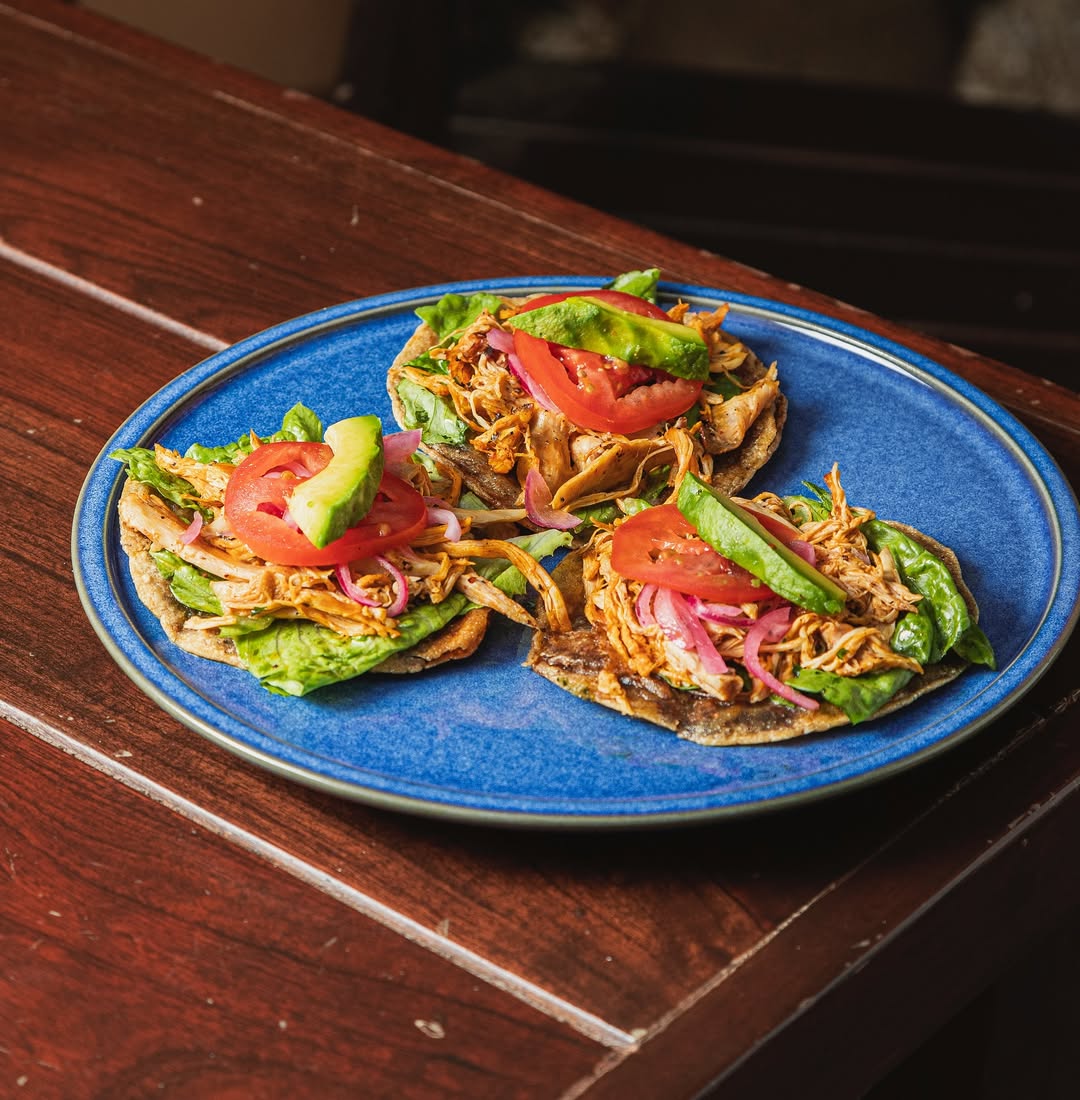 Hecho con tortillas de maíz fritas y rellenas de frijol negro colado. Se sirven con carne generalmente pavo o cochinita, lechuga, tomate, cebolla morada y aguacate, combinando texturas crujientes y sabores frescos.